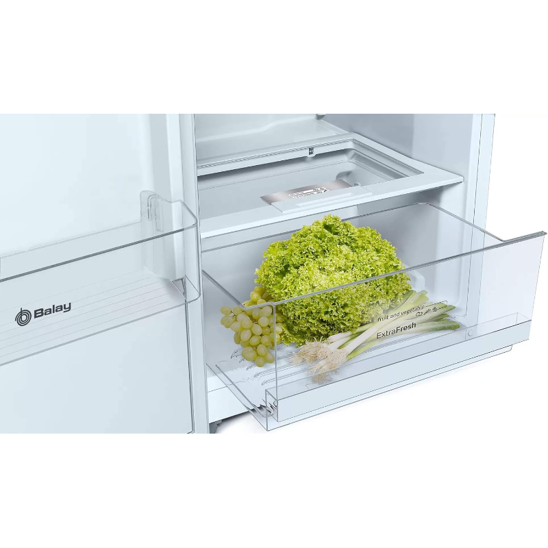 El frigorífico Balay 3FCE563WE cuenta con una capacidad total de 346 litros, distribuidos entre el compartimento del frigorífico y el del congelador. Este modelo incorpora tecnología No Frost, lo que evita la formación de escarcha y facilita su mantenimiento. Dispone de estantes de cristal ajustables, que permiten organizar el interior según las necesidades. El congelador presenta un sistema de congelación rápida, que permite conservar alimentos de forma efectiva. Su clasificación energética es E, lo que indica un consumo eficiente en comparación con otros modelos. Incluye un dispensador de agua, que incrementa la comodidad en el acceso a este recurso. Las dimensiones del aparato permiten su instalación en distintos espacios, sin comprometer su funcionalidad. El frigorífico está diseñado con un sistema de control mecánico, que permite regular la temperatura de ambos compartimentos de manera sencilla. Además, cuenta con un nivel de ruido reducido, lo que favorece un ambiente más silencioso. Los materiales utilizados en su fabricación aseguran una larga vida útil. El aparato está equipado con una puerta reversible, lo que facilita su adaptación al diseño del hogar o espacio donde se instale. Su sistema de refrigeración es estático, garantizando la adecuada conservación de los alimentos. Este frigorífico es compatible con distintos sistemas de instalación y presenta un uso sencillo, gracias a su diseño intuitivo.