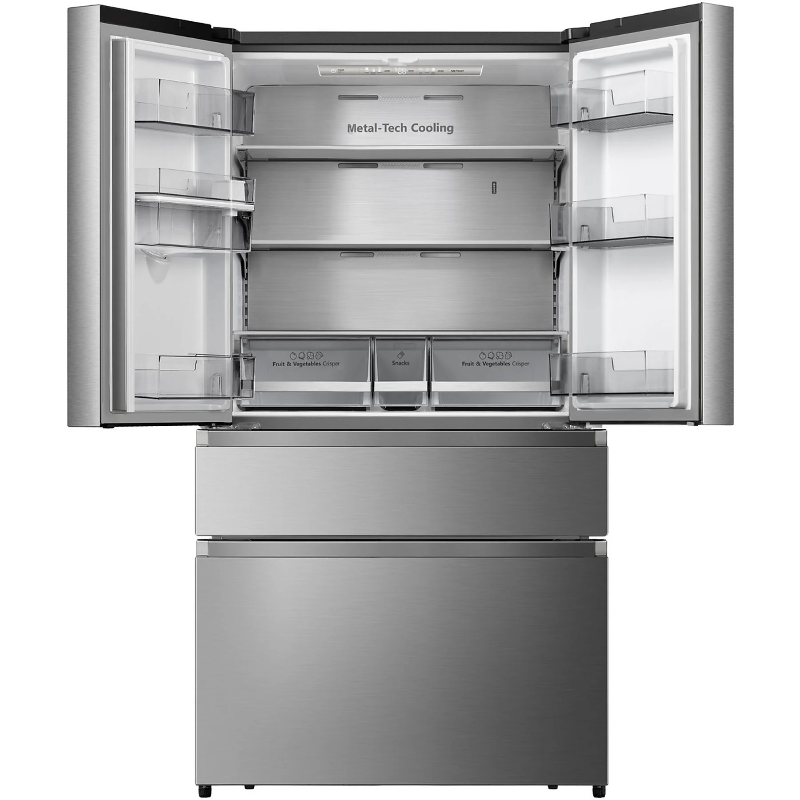 El frigorífico Americano Hisense RF749N4SWSE ofrece una capacidad total de 579 litros, incluyendo un compartimiento de refrigeración y un congelador. Cuenta con tecnología No Frost, lo que elimina la necesidad de descongelar manualmente el interior. El diseño incluye estantes de vidrio templado, que son ajustables para facilitar la organización de los alimentos. El sistema de control de temperatura es electrónico, permitiendo ajustes precisos. Dispone de un dispensador de agua en la puerta frontal y una bandeja para hielo. El modelo incorpora iluminación LED en su interior, mejorando la visibilidad de los productos almacenados. La eficiencia energética del dispositivo está clasificada como E, lo que indica un menor consumo de energía en comparación con otros modelos. Además, el frigorífico tiene un sistema de circulación de aire que mantiene una temperatura constante en el interior. Las puertas son reversibles, lo que permite adaptar la apertura del frigorífico según el espacio disponible. Presenta un compresor que funciona con un nivel de ruido de 42 dB. Este modelo incluye un modo de vacaciones, que permite reducir el consumo energético cuando no se utiliza por un periodo prolongado. Su peso es de 108 kilogramos, y tiene unas dimensiones que se adaptan a espacios que requieren un frigorífico de gran capacidad.
