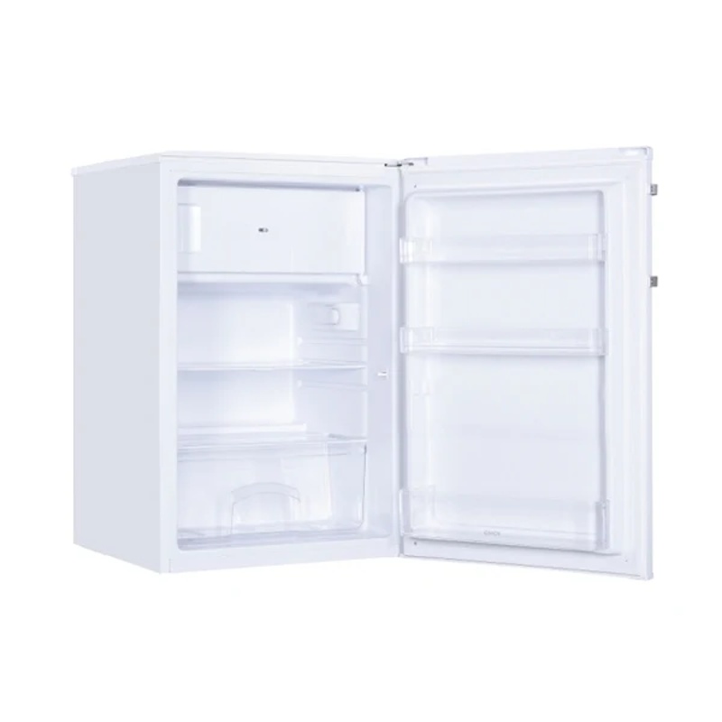 Frigorífico mini con compartimentos de refrigeración y congelación integrados en una sola unidad diseñada para instalación bajo encimera. Presenta una altura de 85 cm y una capacidad total de 109 litros, conforme a los métodos de medición normalizados, con nivel sonoro declarado de 40 dB. Dispone de clasificación de eficiencia energética E según la normativa europea vigente. Incluye cajón destinado a frutas y verduras, estantes interiores y compartimento de congelación. Cuenta con control de temperatura regulable, iluminación interior mediante sistema LED y puerta reversible para adaptación al sentido de apertura requerido. Funciona con alimentación eléctrica estándar conforme a las especificaciones técnicas declaradas por el fabricante.