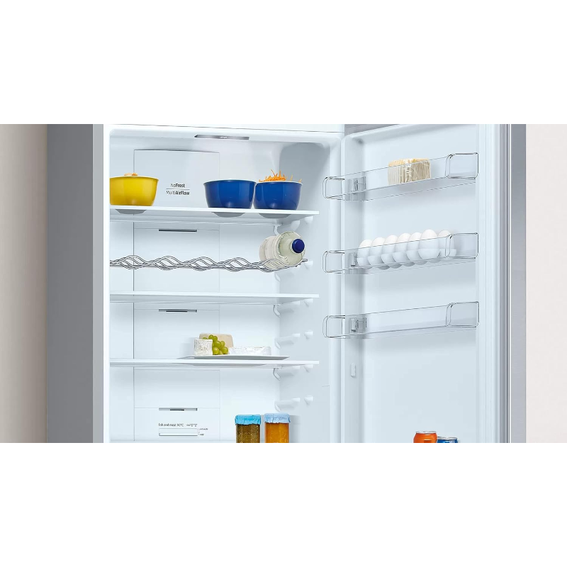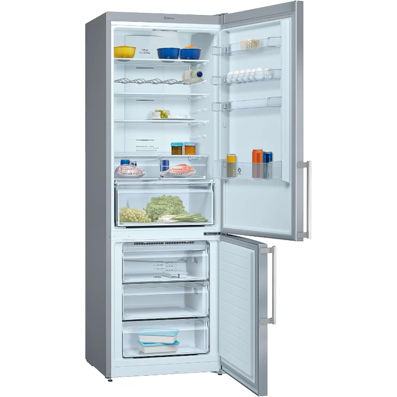 El frigorífico Combi Balay 3KFE776XE tiene una capacidad total de 438 litros y utiliza el sistema de refrigeración No Frost. Este electrodoméstico cuenta con dos compartimentos: el frigorífico y el congelador. El compartimento del frigorífico tiene tres estantes de cristal y un cajón para verduras. El congelador incluye un cajón y una balda. La distribución interna permite el almacenamiento de diferentes tipos de alimentos. Su sistema de refrigeración No Frost evita la formación de escarcha en el interior. El frigorífico se alimenta a través de una conexión eléctrica estándar y presenta un sistema de control mecánico. La clasificación energética del aparato es de clase E, que se mide según la norma energética vigente. El nivel de ruido es de 39 dB, lo que se registra en su ficha técnica. Este modelo tiene un peso aproximado de 75 kg. Su consumo de energía anual está especificado en su documento técnico. Incluye luces LED en el interior para la visibilidad de los contenidos almacenados. Es apto para ser utilizado en espacios cerrados.