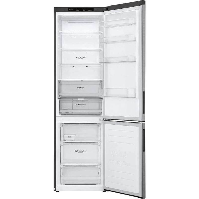 El Combi LG GBP62PZN tiene una capacidad total de 384 litros, con un sistema de refrigeración No Frost, que permite una distribución uniforme del frío y evita la acumulación de escarcha. Este frigorífico cuenta con un compartimento de refrigeración y un compartimento de congelación. La unidad está equipada con estantes de vidrio ajustables y un sistema de iluminación LED para una mejor visibilidad interna. También incluye un cajón para frutas y verduras, diseñado para conservar la frescura de los alimentos. La temperatura se controla mediante un panel de control externo, donde se pueden ajustar las configuraciones de refrigeración y congelación. El dispositivo funciona con un compresor que regula automáticamente la temperatura interior, garantizando que se mantenga adecuada para la conservación de alimentos. Dispone de un sistema de estantes que permite organizar eficazmente los productos almacenados. La clasificación energética es de tipo A, contribuyendo a una menor eficiencia energética en comparación con otras categorías. El frigorífico LG GBP62PZN tiene un diseño de puerta reversible, lo que permite adaptar la apertura de la puerta a diferentes espacios. La noise level es de aproximadamente 39 dB, lo que se considera un nivel bajo de operación. Además, el frigorífico incluye una función de descongelación manual en el compartimento del congelador.