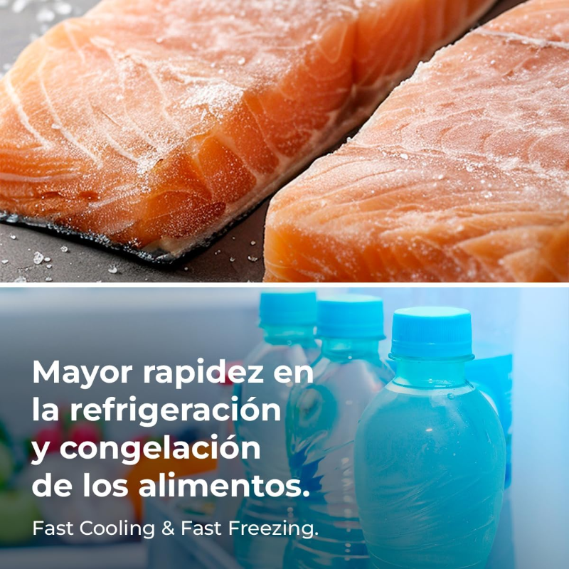 El frigorífico combi E 117L de Cecotec Bolero CoolMarket presenta un diseño de dos compartimentos, con un frigorífico y un congelador en la parte inferior. Su capacidad total es de 217 litros, distribuidos en 158 litros para el frigorífico y 59 litros para el congelador. Incorpora estantes de cristal ajustables, que facilitan la organización de los alimentos. El dispositivo cuenta con un termostato interno que permite establecer la temperatura deseada en el compartimento del frigorífico, mientras que el congelador tiene una temperatura fija. La puerta del frigorífico se puede instalar en ambos lados, lo que brinda flexibilidad en la ubicación del aparato. Utiliza un sistema de refrigeración por compresor y funciona con una eficiencia energética clasificada en la categoría E, según la normativa vigente. Este modelo cuenta con una bandeja para verduras y un compartimento para huevos en la puerta. Las dimensiones generales del frigorífico son 176 cm de altura, 54 cm de ancho y 58 cm de profundidad. El producto incluye un manual de usuario y garantías de funcionamiento conforme a la legislación actual. Este frigorífico combina las funciones de refrigeración y congelación en un solo aparato, permitiendo la conservación y almacenamiento de una variedad de alimentos y productos.