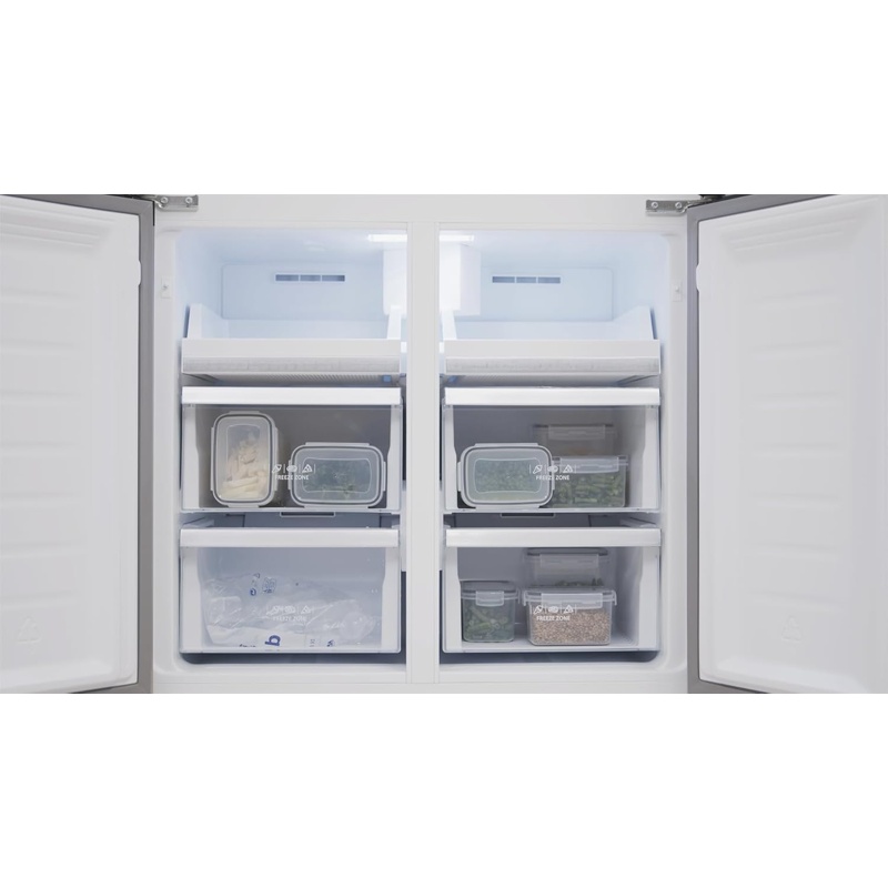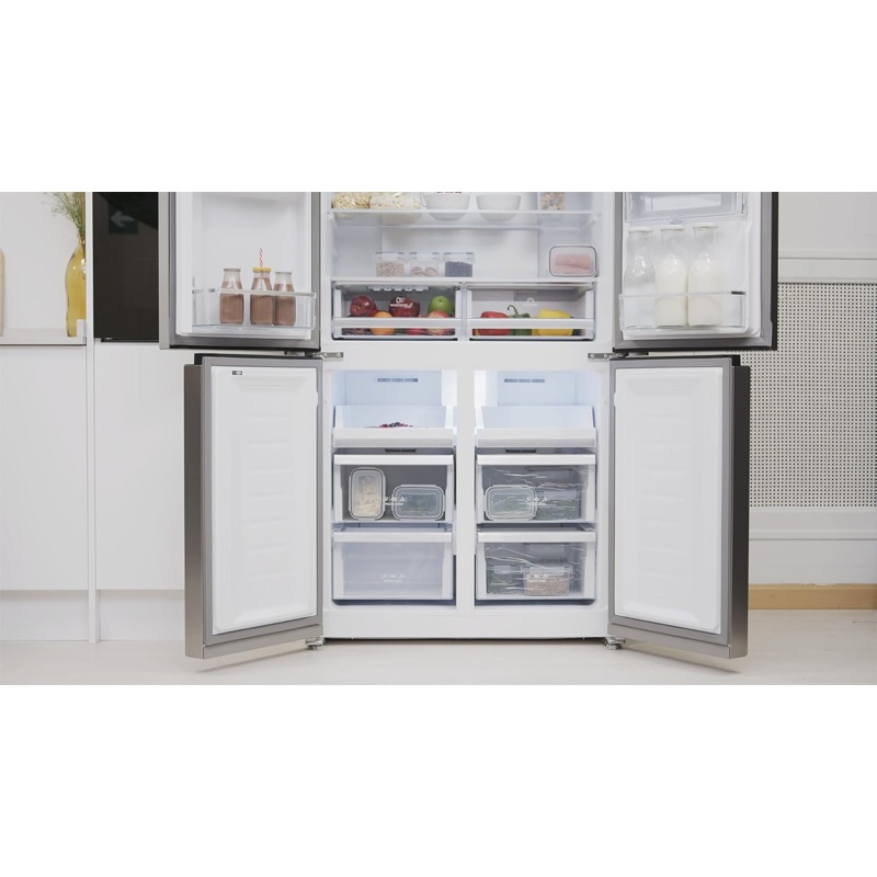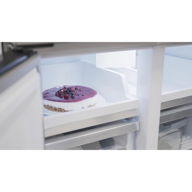 El frigorífico EVVO F100 cuenta con una capacidad total de 490 l, distribuidos en 321 l en el compartimento principal y 169 l en el congelador. Está equipado con motor Inverter, sistema Total No Frost, tecnología Freon Free y pantalla exterior para control de temperatura. Dispone de cuatro puertas con ventilación interna que mantiene la temperatura uniforme en todos los compartimentos. Incluye estantes ajustables, cajones para almacenamiento y control electrónico de funciones, con display externo para visualización de temperaturas y ajustes. La eficiencia energética está clasificada como E según normativa vigente, y los compartimentos permiten la organización de alimentos con distribución interna optimizada.