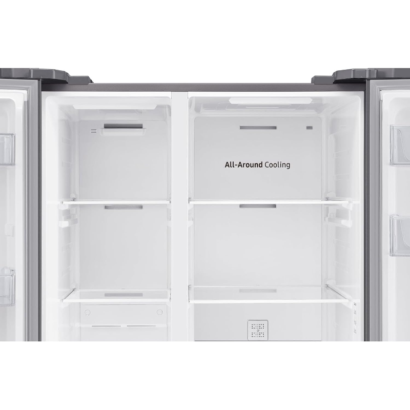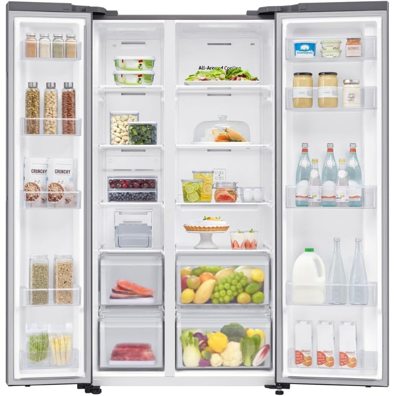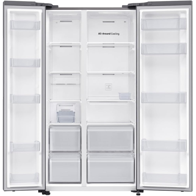 Frigorífico Americano Samsung RS62DG5003S9/EF cuenta con una capacidad total de 655 litros y un sistema No Frost que evita la acumulación de hielo, facilitando el mantenimiento. La distribución del espacio incluye un compartimento de refrigeración y un congelador, permitiendo almacenar alimentos de diversas dimensiones. El diseño interno incluye estantes de vidrio templado, bandejas ajustables y contenedores para frutas y verduras, optimizando el uso del espacio. El dispositivo posee dispensador de agua externo y generador de hielo, su sistema de control de temperatura es digital, lo que permite ajustes precisos en las secciones de refrigeración y congelación. Su compresor ofrece un funcionamiento continuo y una eficiencia energética clasificada. Tiene un nivel de ruido que no supera los decibelios establecidos como estándar para electrodomésticos de este tipo. También cuenta con un sistema de iluminación LED en el interior, que proporciona visibilidad al organizar los alimentos. Este frigorífico es compatible con la red eléctrica estándar y cumple con las regulaciones de seguridad pertinentes. Su diseño es de dos puertas, facilitando el acceso a ambos compartimentos. La garantía ofrecida por el fabricante se adapta a las normativas vigentes.
