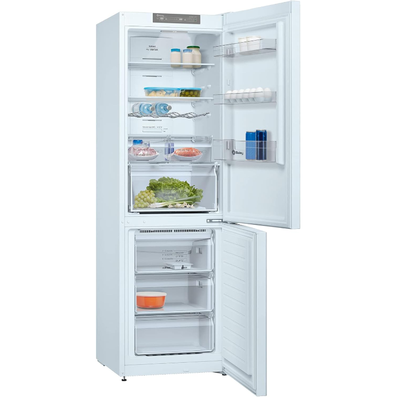 El Frigorífico Combi Balay 3KFE563WI tiene una capacidad total de 324 litros, que se distribuye en un compartimento de refrigeración y un congelador. Este modelo está equipado con tecnología No Frost, que impide la acumulación de hielo y simplifica el mantenimiento del aparato. Dispone de estantes de vidrio ajustables en el interior del refrigerador, permitiendo una gestión eficiente del espacio disponible. El congelador cuenta con capacidad para almacenar alimentos congelados y presenta una clasificación energética de E, lo que facilita la comprensión de su eficiencia en el consumo eléctrico. Además, presenta un sistema de control mecánico para regular la temperatura según las necesidades del usuario. Incluye también cajones en el compartimento de frutas y verduras, diseñados para conservar estos alimentos en condiciones óptimas. Su diseño incluye puertas reversibles, lo que permite adaptarlo fácilmente a cualquier tipo de ambiente. Emplea refrigerantes que cumplen con la normativa medioambiental vigente. Las dimensiones específicas del aparato permiten una integración en espacios estándar de cocina, y su instalación no requiere herramientas adicionales. Este frigorífico presenta un nivel de ruido de 39 dB, lo que contribuye a un funcionamiento silencioso en el entorno donde se ubique.