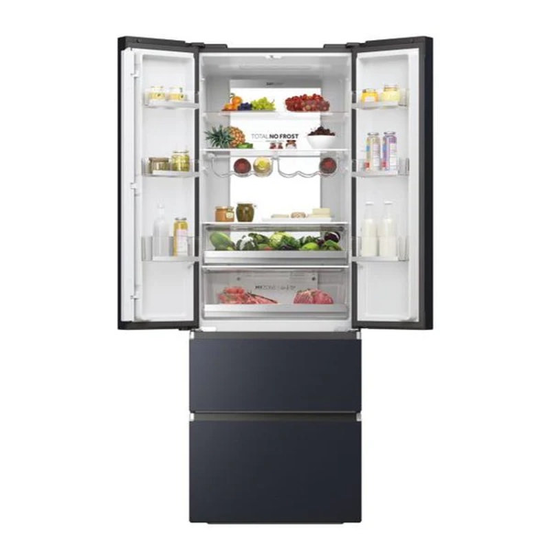 Frigorífico de puerta francesa con compartimentos independientes de refrigeración y congelación integrados en una sola unidad. Presenta una anchura de 70 cm, una altura de 200 cm y una capacidad total de 479 litros, conforme a los métodos de medición normalizados. Cuenta con clasificación de eficiencia energética E según la normativa europea vigente. Incorpora sistema de refrigeración Total No Frost para la gestión automática de la escarcha y la circulación interna del aire. Incluye cajones de acceso directo, un compartimento con control de temperatura independiente y un cajón con regulación de humedad para la conservación diferenciada de alimentos. El sistema de refrigeración funciona mediante compresor con tecnología Inverter. Dispone de control electrónico de temperatura, conectividad WiFi para funciones compatibles e iluminación interior mediante sistema LED. Funciona con alimentación eléctrica estándar conforme a las especificaciones técnicas declaradas por el fabricante.