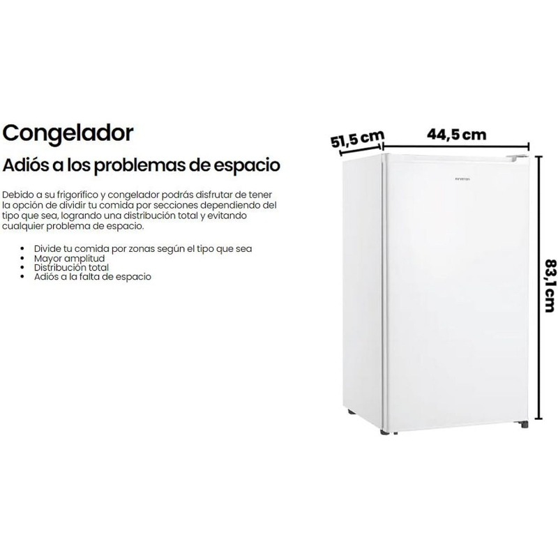 El frigorífico Puerta Infiniton CL-92L8WEV tiene una capacidad total de 88 litros. Presenta un diseño de una puerta con un sistema de refrigeración estático. Su compresor utiliza energía eléctrica y cuenta con una clasificación energética que puede ser verificada en la etiqueta energética. Este modelo incluye estantes de vidrio, que se pueden ajustar en diferentes posiciones para optimizar el espacio interior. Está equipado con un compartimiento para frutas y verduras, así como con baldas en la puerta para la colocación de botellas y otros productos. El frigorífico opera a una temperatura máxima de 8 grados Celsius, lo que es adecuado para el almacenamiento de alimentos perecederos. Su sistema de refrigeración permite mantener una temperatura óptima en el interior, contribuyendo a la conservación de los productos almacenados. Este dispositivo tiene un nivel de ruido que puede ser consultado en las especificaciones técnicas. Las dimensiones exactas del producto están disponibles en la hoja de datos del fabricante. La instalación de este frigorífico debe realizarse de acuerdo con las instrucciones del fabricante, y el aparato necesita estar conectado a una fuente de electricidad compatible.