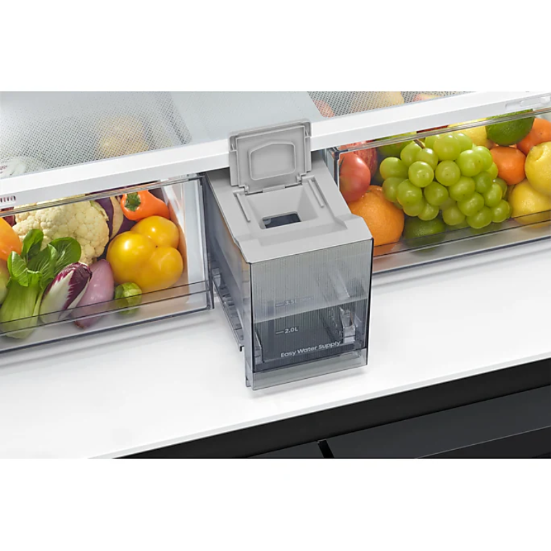 El frigorífico Samsung RF59C700EB1/ES tiene unas dimensiones de 177.9 cm de altura y 91.2 cm de ancho, ofreciendo una capacidad total de 649 litros. Este modelo cuenta con un sistema de refrigeración No Frost, diseñado para prevenir la acumulación de escarcha en el interior. El interior se organiza con estantes de vidrio templado, que permiten almacenar alimentos de diferentes tamaños. Este dispositivo incorpora un dispensador de agua y hielo, accesible desde la puerta. Además, presenta un sistema de control digital, que permite ajustar la temperatura de forma precisa. El frigorífico incluye zona de congelación y compartimientos específicos para frutas y verduras, diseñados para mantener los productos frescos. Sus puertas están diseñadas para una apertura fácil y cuentan con cierre magnético. La eficiencia energética se clasifica en función de su consumo, lo que se refleja en su etiquetado energético. Este producto es compatible con la conectividad SmartThings, permitiendo a los usuarios controlar ciertas funciones de forma remota. La superficie externa es de acero inoxidable, lo que facilita su limpieza. Dispone de varios compartimentos para facilitar la organización de los alimentos.